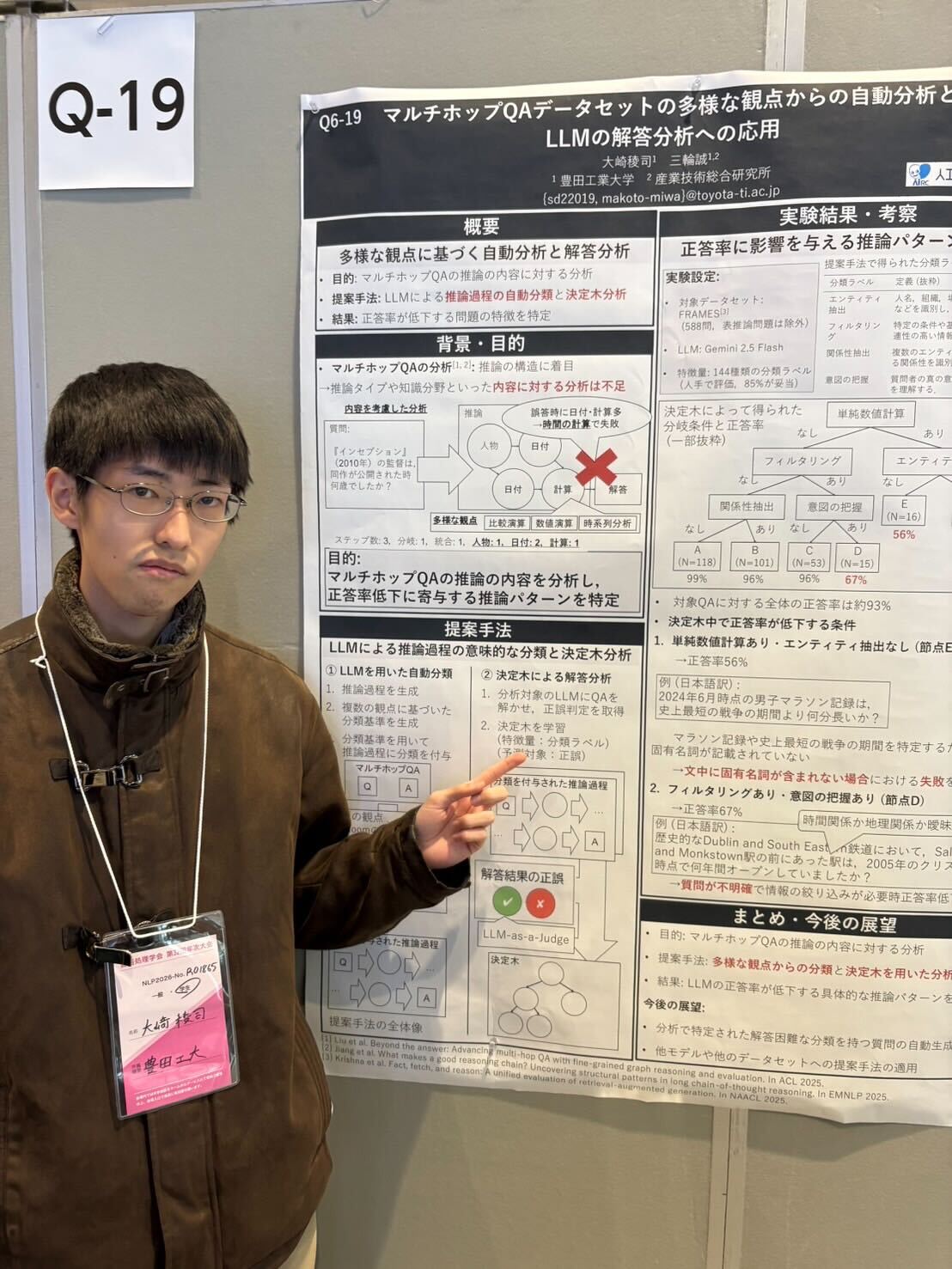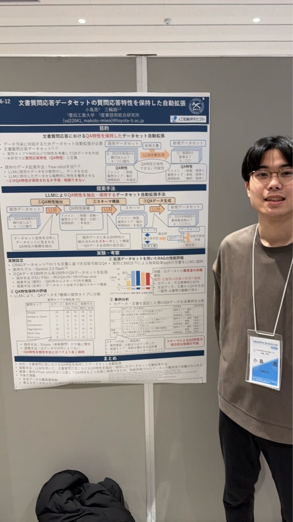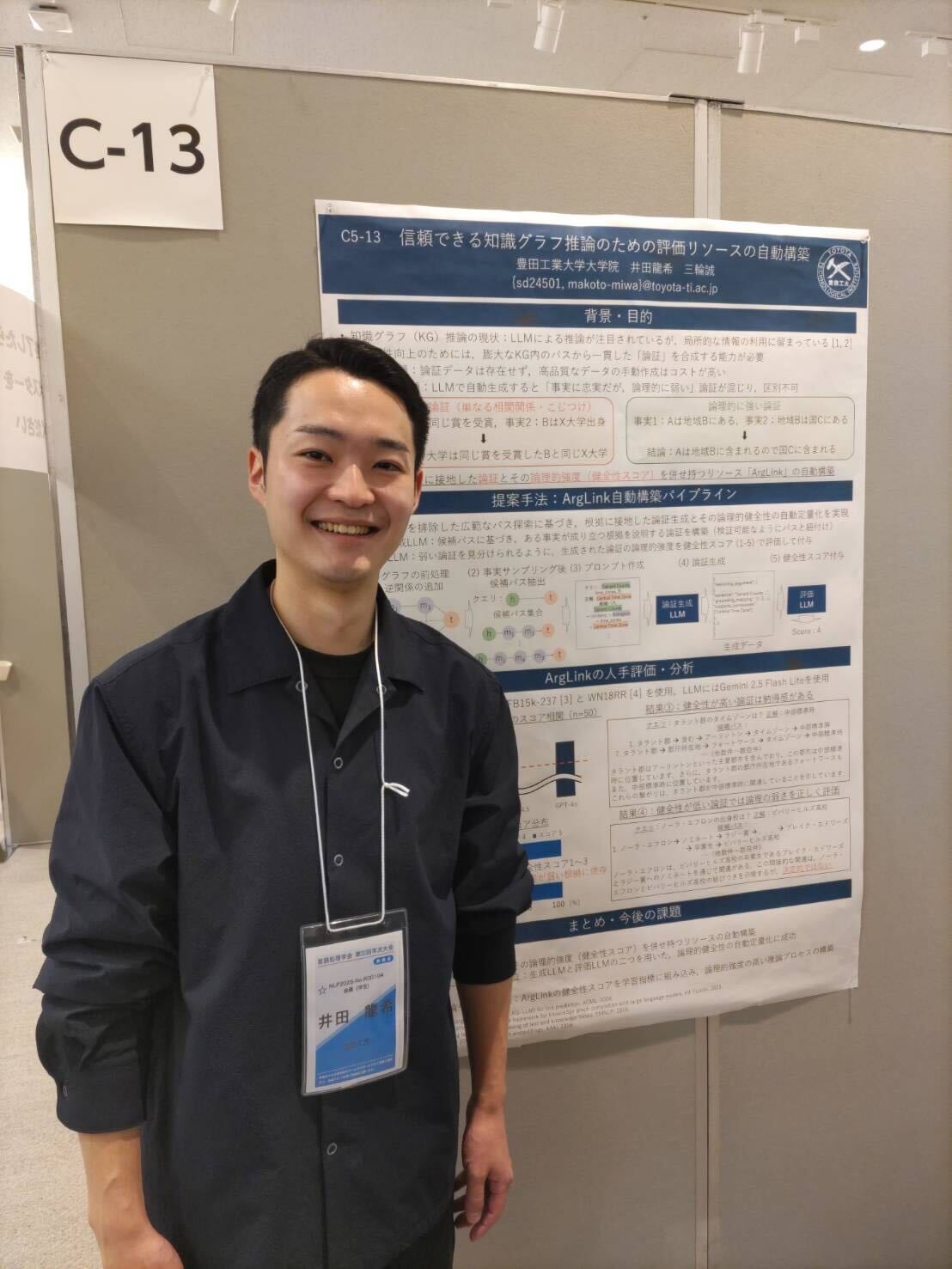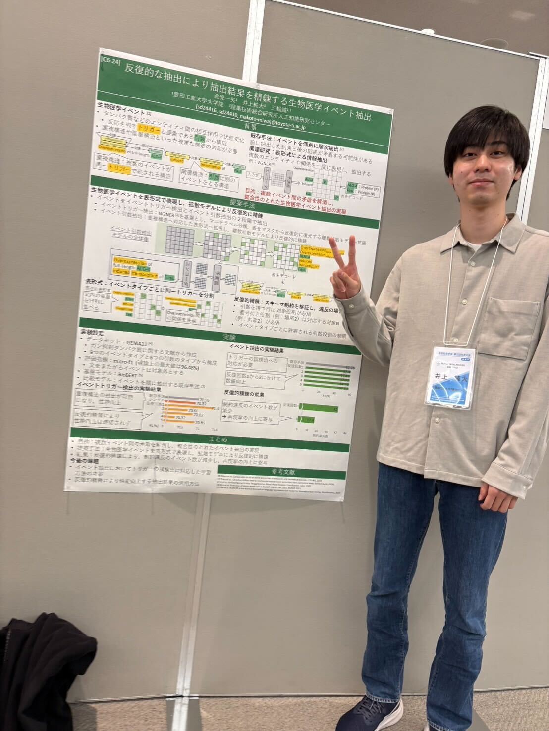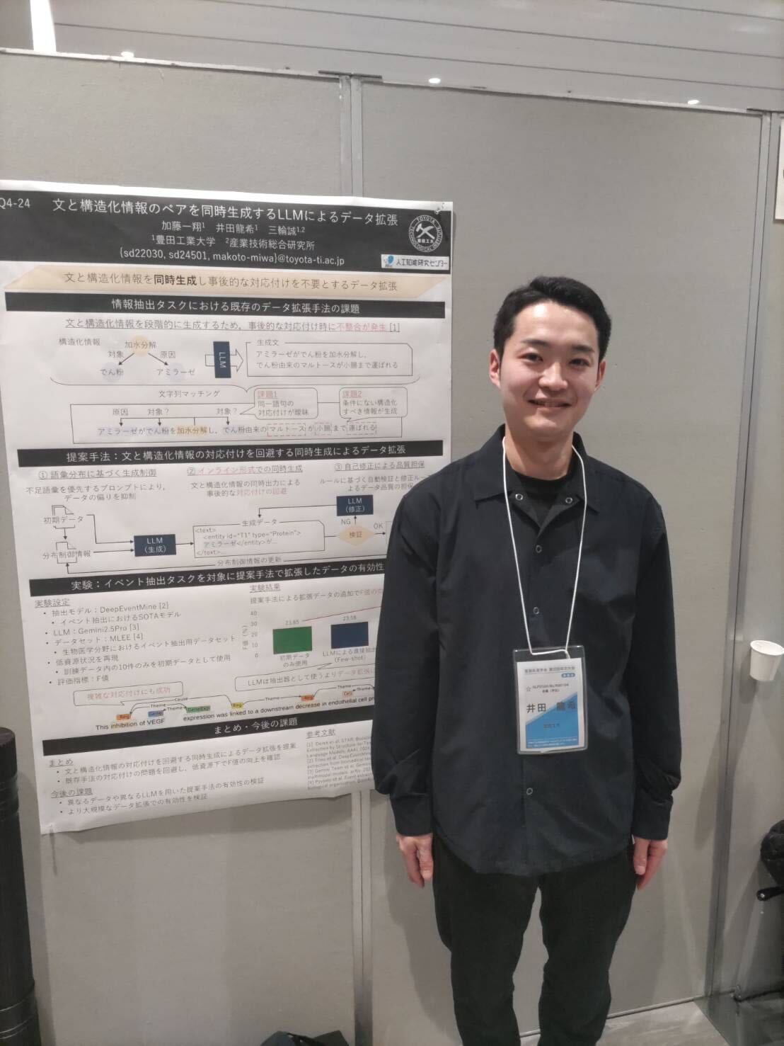 当研究室のB4: 3名,M1: 1名,M2: 1名,D1: 1名の計6名の学生が,NLP2026において8件のポスター発表を行いました.また,M1 の西出さんの論文は若手奨励賞を受賞し,口頭発表を行いました. 発表前の様子