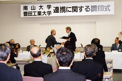 同じ愛知県内(名古屋市)にある南山大学と相互補完的な交流をめざし、2003年6月に大学間協定を締結し、教育面、研究面から事務部門までに至る広範囲な分野において積極的に交流を図っています。 2004年3月に単位互換協定を締結し、10月から単位互換事業を実行に移しました。 豊田工業大学生は南山大学の教養科目、外国語科目を履修し、南山大学生(理工学部)は豊田工業大学の専門科目を履修し、相互補充的機能を果たしています。