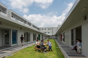 寮外への出入りには、コモンルームを経由し、必ず中庭を通る構造としている。中庭にはベンチなどを設置し、長屋が連なる「下町の路地裏」のように、他ユニットの学生や教員との交流促進を図る場となっている。