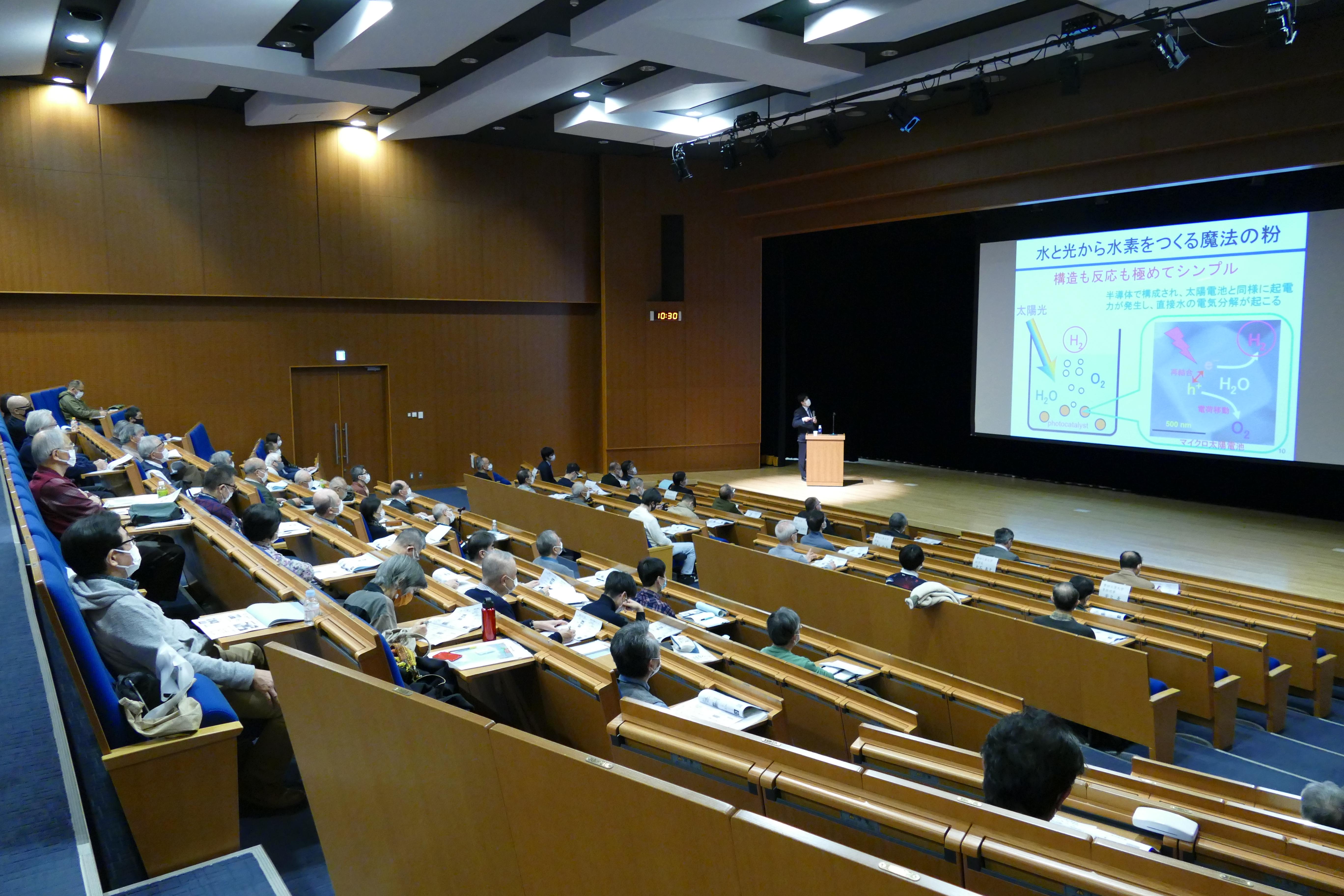 「『再生可能エネルギー』の展望と可能性」をテーマに、本学の山方啓 准教授(工学部 光反応化学研究室)は「太陽光を使って水から水素を製造できる光触媒の研究」について、南山大学からは、鶴見哲也 准教授(総合政策学部 総合政策学科)が「我々は再生可能エネルギー普及にどのように関わっていくべきか」と題し、講演を行いました。