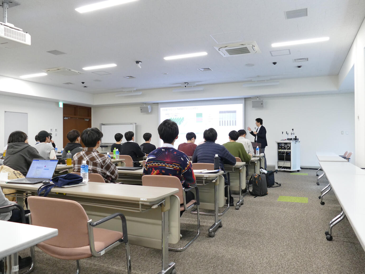 また、岐阜大学の久保 理 教授からは、シリコン以外の新しい半導体素材などの研究成果について解説し、そして「研究者をやっていると外国人も含め、研究を通じた人的ネットワークが広がる。そこの楽しさもあるし、自分がやりたいと思っていることに向き合えるため、自身の人生を充実させることもできる」と、研究者としてのウェルビーイングにも触れ、学生が将来について考える際の参考となるメッセージも発信しました。
