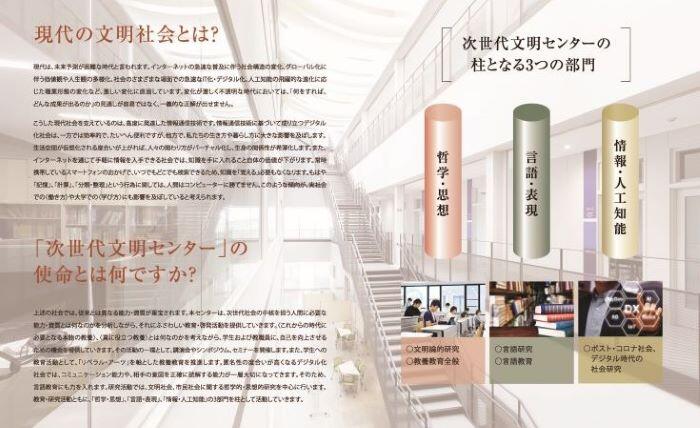 次世代文明センターは教育・研究の両機能を併せ持つ人文社会系・教養教育系を中心とした文理融合型のセンタ ーです。