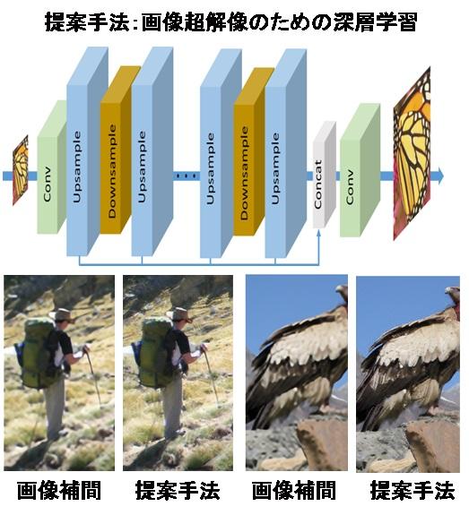 小さい画像を大きく拡大する応用は,昔の映像のアップコンバートや(例:DVD映像を4K映像にする),無線通信などの限られた通信帯域で送受信された画像・映像の高精細化など,多くの実応用が期待されます.しかし,一般的な補間計算による画像拡大では,画像はボケてしまいます.そこで,「このように縮小された画像の元の大きな画像は,このような見え方である」という対応関係を大量の撮影画像から学習しておくことで,高精細な画像拡大(超解像)を実現します.この超解像に加え,類似したフレームワークで多様な画像拡張技術を研究します.