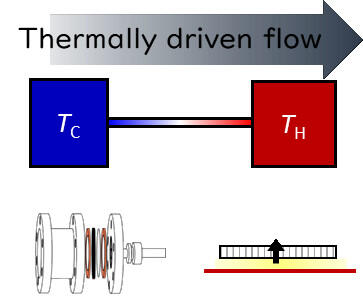 高クヌッセン数環境では温度勾配によって低温側から高温側へ流れが誘起されます.この流れは熱遷移流と呼ばれます.温度分布だけで流れが生じることから,クヌッセンポンプと呼ばれる,可動部がなく騒音や振動のないメンテナンス不要のポンプを作ることができます.それだけではなく微小物体の浮上や移動,マイクロデバイスに利用することも検討されています.流れが誘起される機構の解明や特性の調査を行うとともに,応用技術への展開を行っています.