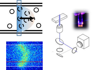 高クヌッセン数環境では音速に匹敵する熱速度を持つ非常に微小な分子の運動を捉えなければならないことから,利用できる計測手法に限りがあります.そこで,レーザー光により分子にエネルギーを与えることで分子を発光させるレーザー誘起蛍光法(LIF)を利用して,見えない分子の様子を撮影できるようにします.この分子からの発光を利用した流速計測手法である分子タギング速度計測法(MTV)の微小空間への適用を目指し,計測法の改良を行っています.