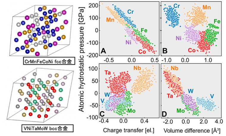 ハイエントロピー合金とその原子応力.独自の第一原理原子応力計算により,合金構造によるその応力の発現機構が異なることを明らかにした.