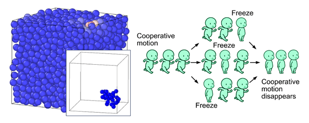 金属ガラスの変形素子と,独自の解析手法,原子凍結法の概念図.シミュレーションによって協調運動として塑性変形素子を抽出することに成功した.
