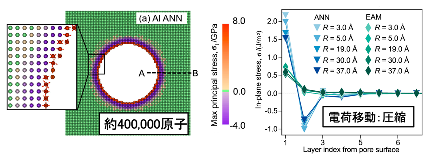 Al約40万原子からなる円孔モデルとその近傍の原子応力分布.機械学習分子動力学法により電荷移動による応力場の発現を大規模原子系上で計算することに成功した.